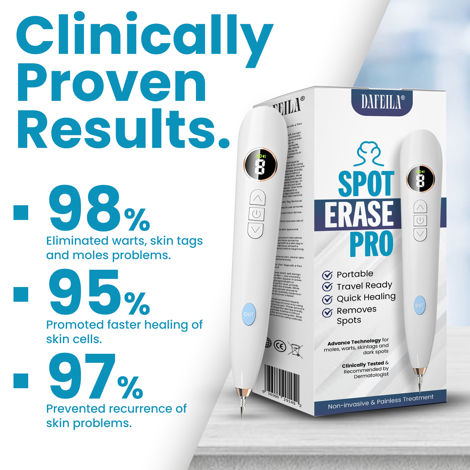 Dafeila® Shot Erase Pro is backed by clinically tested technology designed to safely and effectively remove skin tags, moles, dark spots, and more. Trusted by professionals and proven to deliver visible results within days — without pain, scarring, or downtime. Your clear, confident skin starts here.