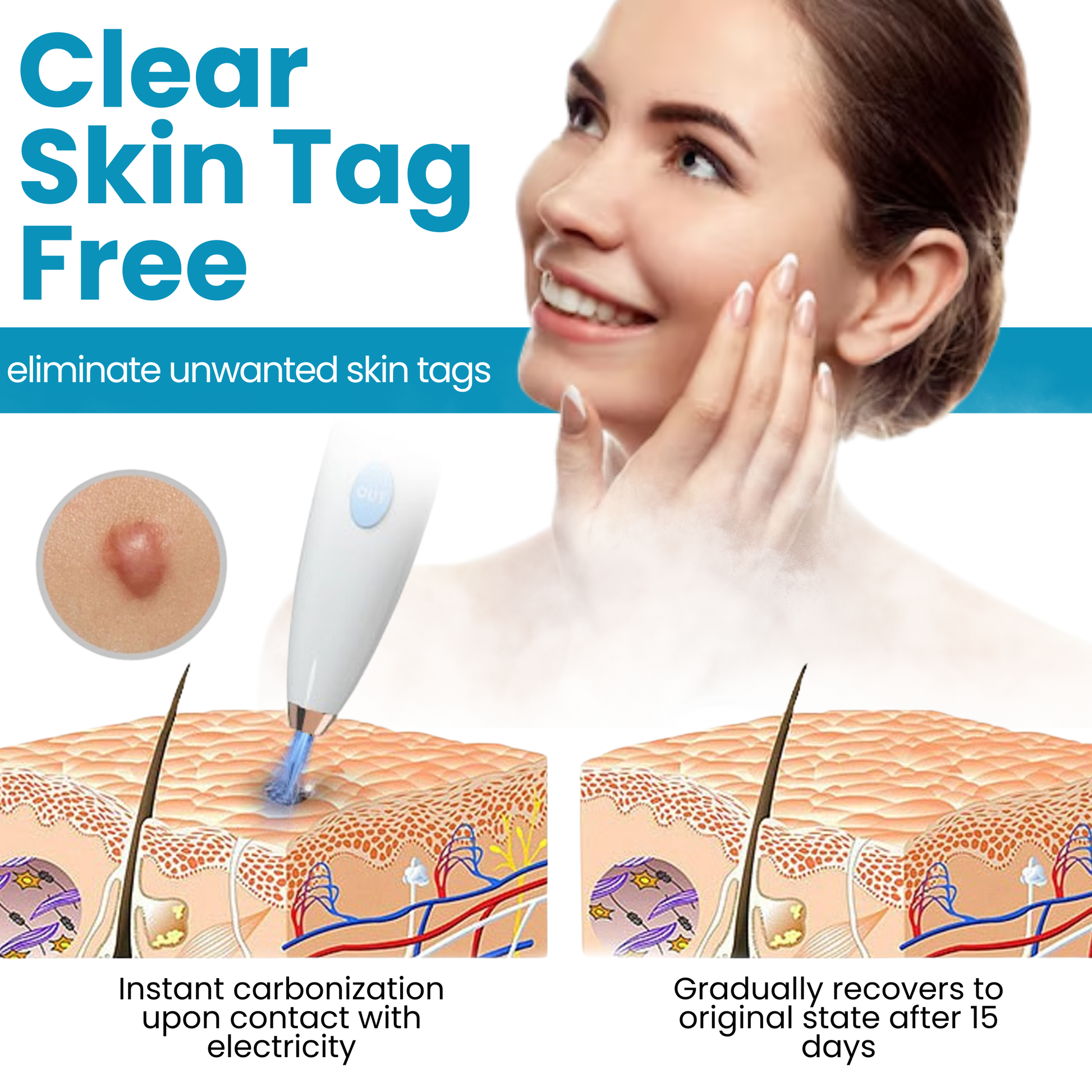 The targeted tip delivers controlled energy directly to the skin tag, causing it to shrink, darken, and naturally fall off within a few days — all without cutting, bleeding, or scarring. It's a quick and painless way to get smooth, tag-free skin at home.