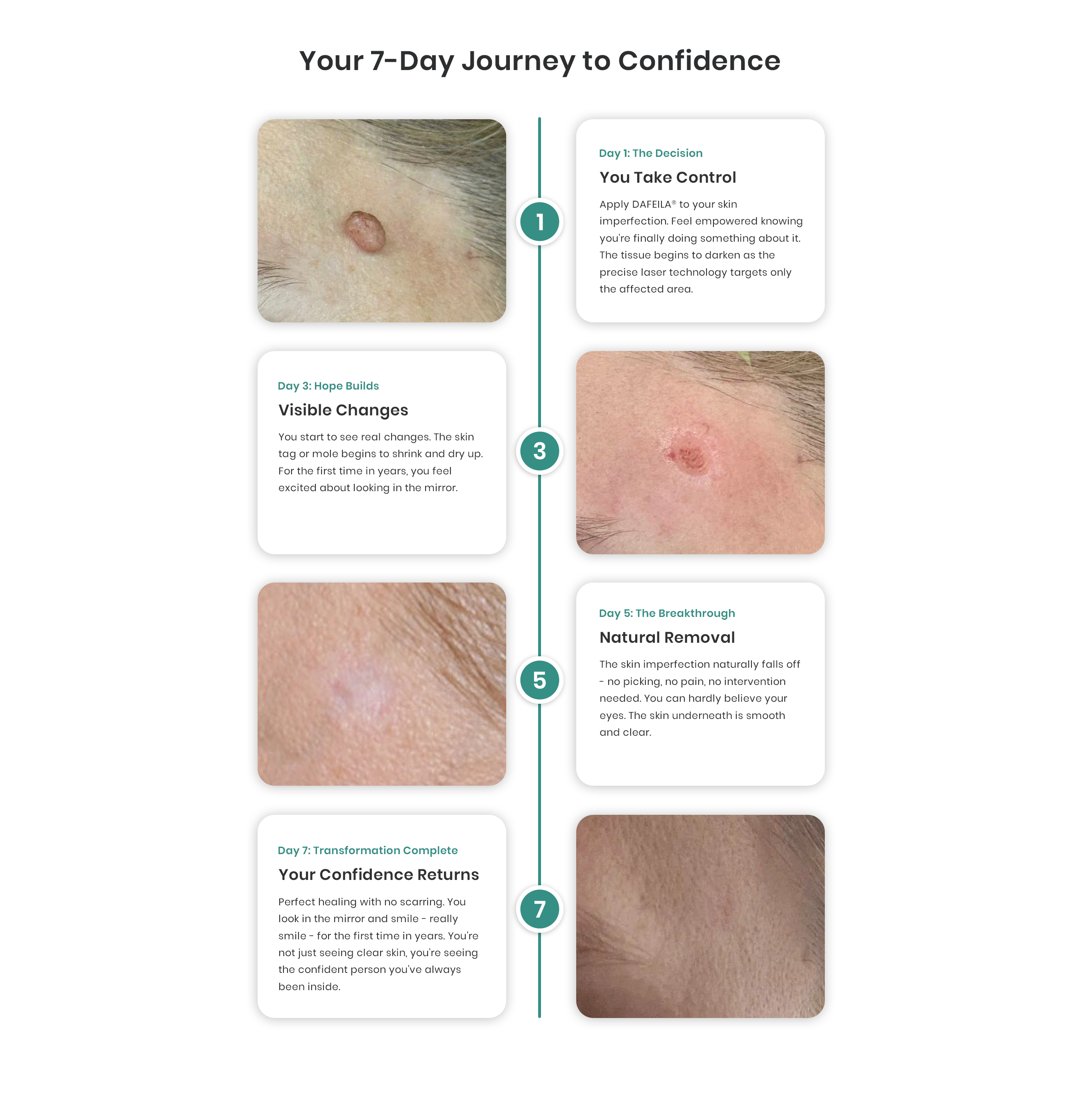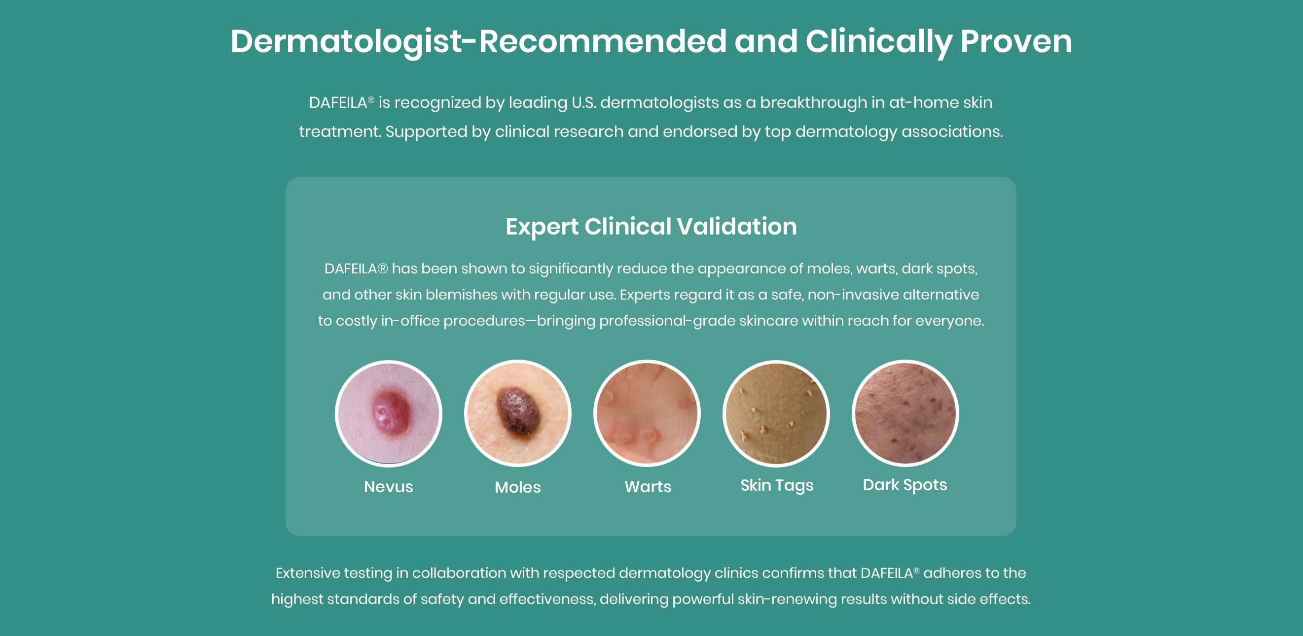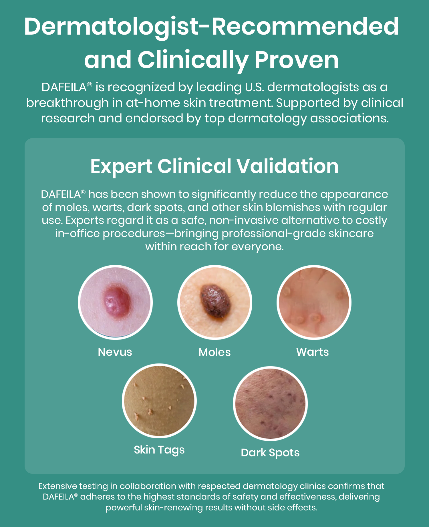 • DAFEILA® is recognized by leading U.S. dermatologists as a breakthrough in at-home skin treatment. Supported by clinical research and endorsed by top dermatology associations, DAFEILA® has been shown to significantly reduce the appearance of moles, warts, dark spots, and other skin blemishes with regular use. Experts regard it as a safe, non-invasive alternative to costly in-office procedures—bringing professional-grade skincare within reach for everyone.