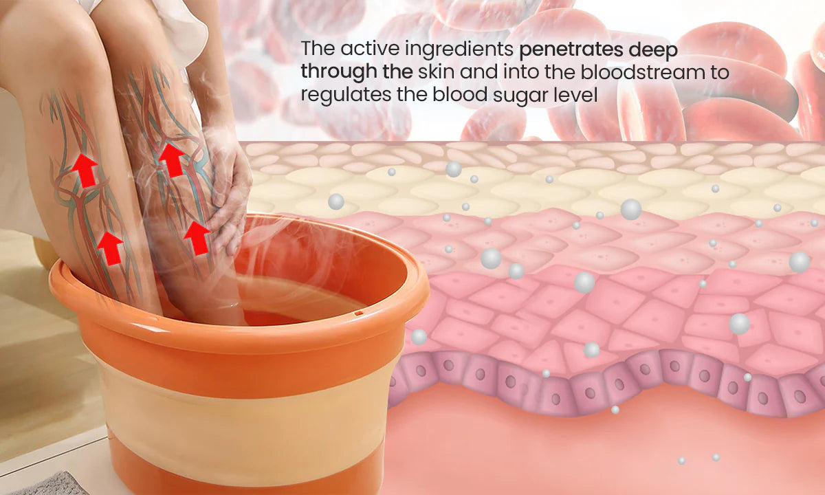 The foot spa delivers a potent blend of natural ingredients directly to the bloodstream through transdermal absorption to effectively lower blood sugar levels and stimulate the pancreas to produce insulin