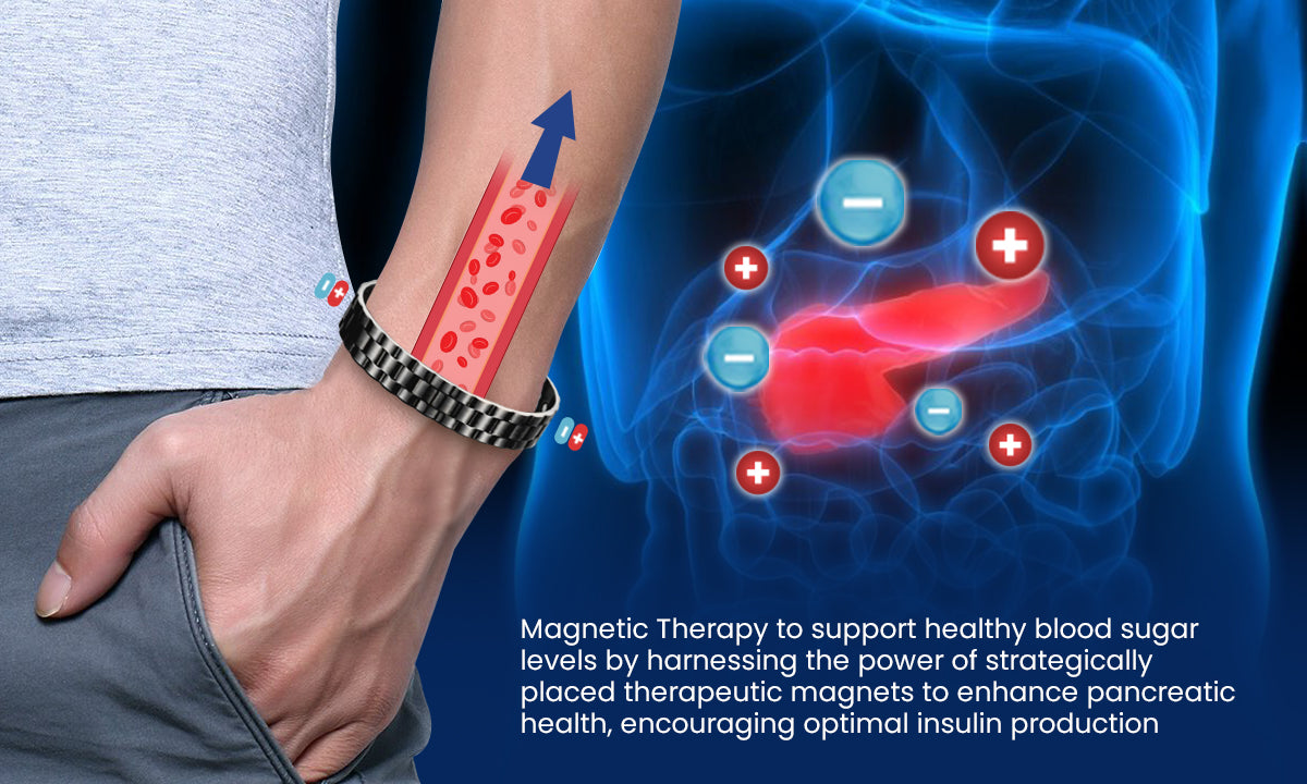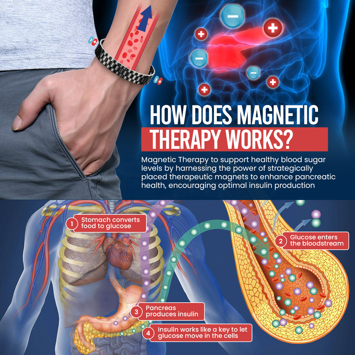 The bracelet uses strategically placed magnets that create a magnetic field, which is believed to stimulate key pressure points and improve circulation, potentially enhancing insulin sensitivity and supporting balanced blood sugar levels.