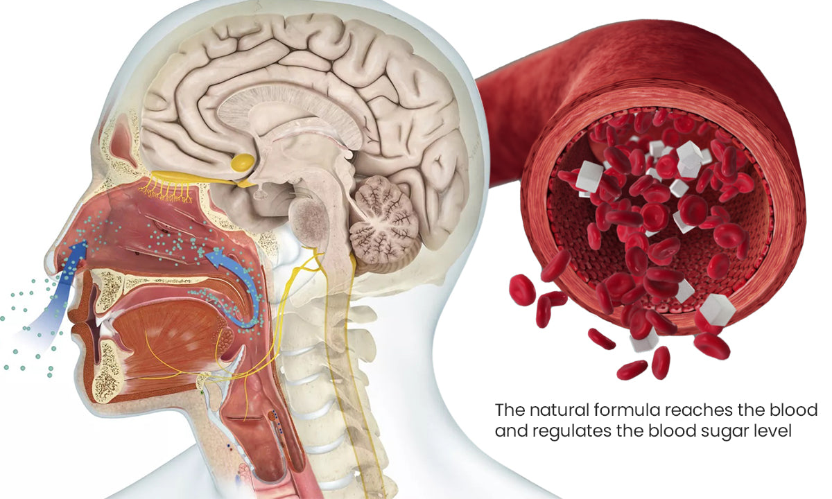 The nasal spray contains a unique formulation of natural compounds that stimulate receptors that signal the pancreas to release insulin, helping to regulate blood sugar levels effectively.
